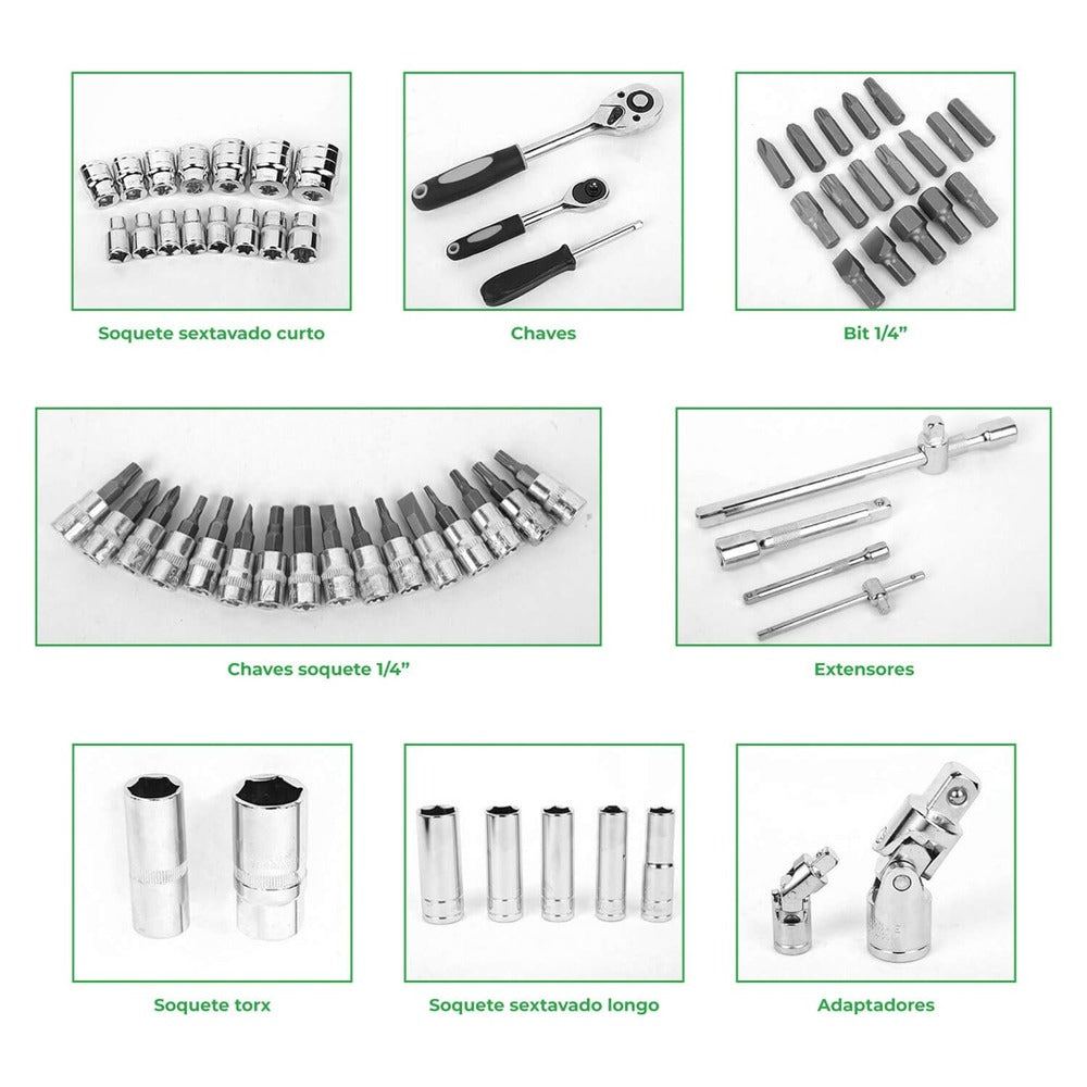 Esse conjunto inclui uma variedade de ferramentas manuais, como chaves, soquetes, alicates e muito mais, projetadas para uma ampla variedade de aplicações, como reparos automotivos, manutenção de veículos e trabalhos de casa. Esses conjuntos de ferramentas são utilizados por mecânicos profissionais, engenheiros e técnicos de manutenção.