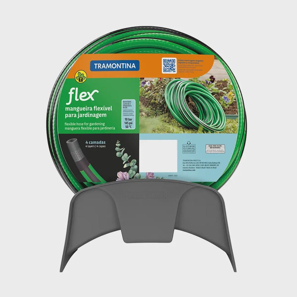 Kit mangueira flex Tramontina na cor verde com faixa preta, é produzia com matérias super resistente, possui 25 metros de comprimento, construída em pvc, proporcionando um fluxo de água eficiente e com durabilidade.